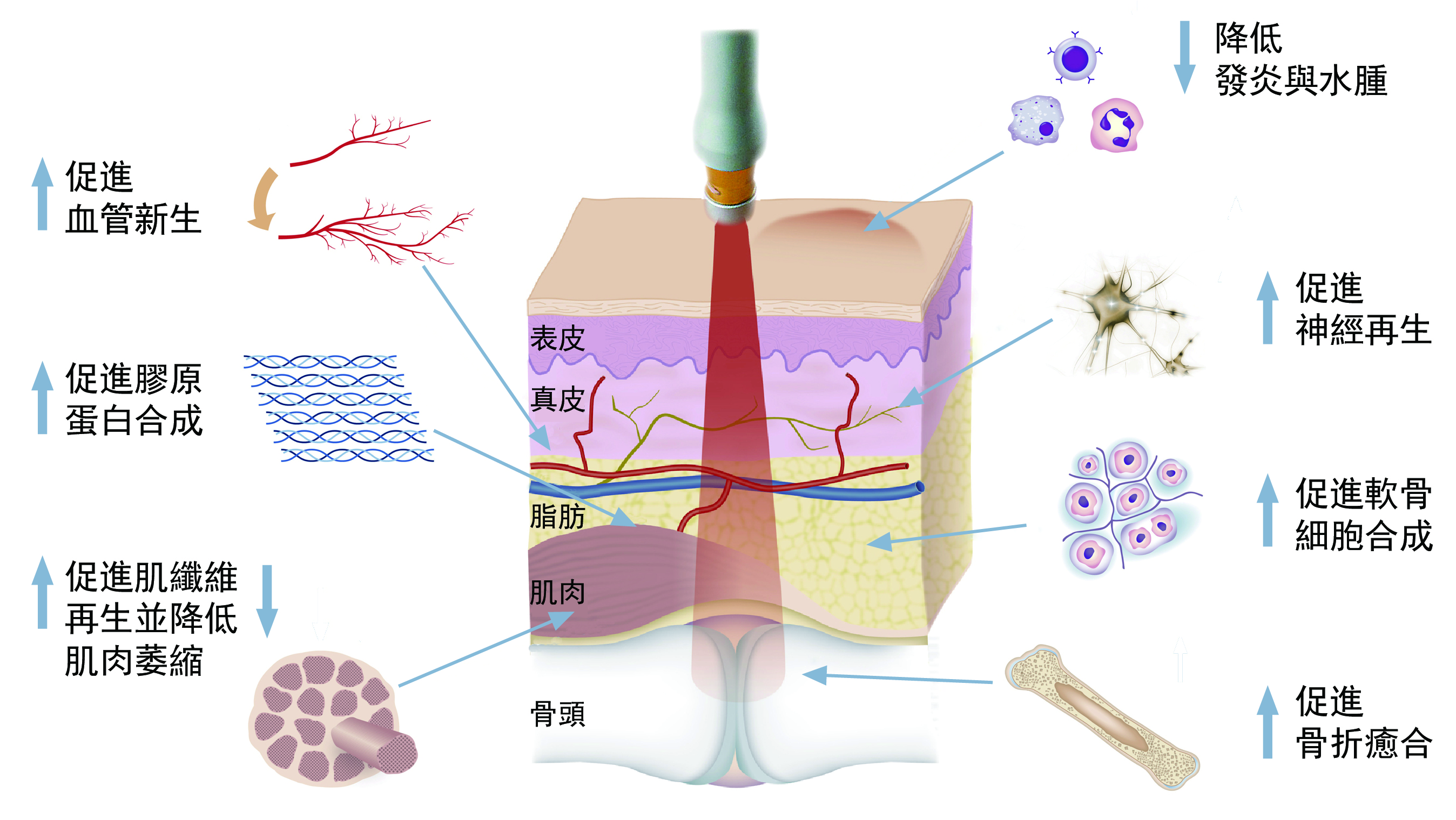 雷射具有三大效應:光機械、光化學、光熱效應,可介入細胞修補過程,活化細胞內粒腺體氧化作用(CCO)、增加細胞內ATP(又稱三磷酸腺苷,人體能量來源)產生,提供細胞修補之動能,縮短修復期。