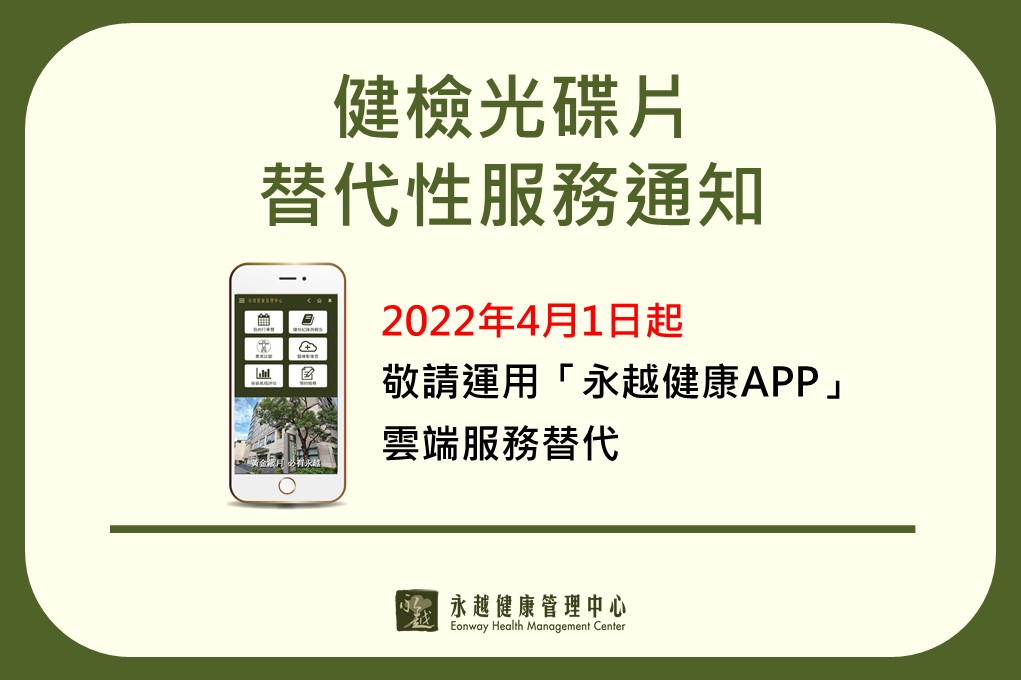 永越自成立18年以來,持續創新服務,以提升更好的品質和效率。由於院方近幾年持續接到貴賓反饋,電腦無光碟機設備無法讀取光碟,加上環保及使用便利性考量,現有健檢光碟片,自2022年4月1日起將不再提供,貴賓可運用「永越健康APP」 的雲端服務替代。