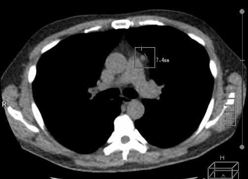 胸部X光在檢測縱膈腔方面有其限制,但CT能更精確發現異常。這篇研究顯示,縱膈腔病變在第3類中並不多,但比例相對較高(5例/9例占56%)。至於小於1公分的胸腺腫塊則被歸為第2類,但仍須密切追蹤與評估。一名49歲醫療儀器公司高階主管來本院健檢,於2015及2016年時的LDCT發現前縱膈腔有一個穩定小結節(7.4 mm) (圖3),分類為第2類,後來年度健檢他選擇一般胸部X光為主的方案。直到2023年再次LDCT檢測結果發現原本前縱膈腔小結節長大成約6公分的腫塊,此時可歸屬到第3類,經轉診手術證實為胸腺瘤WHO分類AB型,幸好只有顯微下腫瘤包囊受侵犯。