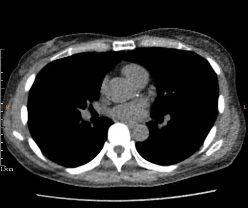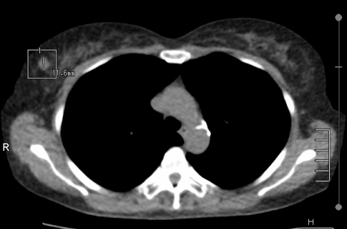 乳房病變以乳房攝影與超音波為基本篩檢工具,對於細微的變化CT是毫無置喙之處,但若看見明顯病灶仍有值得一提的時候。有位58歲退休副護理長在LDCT時發現右乳房有新增軟組織結節 (圖2),經乳房超音波檢查後高度懷疑是乳癌 (BI-RADS 4B),3星期後手術證實是侵犯性乳管癌第二期。