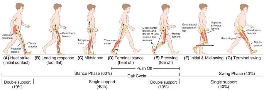 站立期:從腳跟著地→足部平放→中立支撐→腳跟離地→腳趾離地