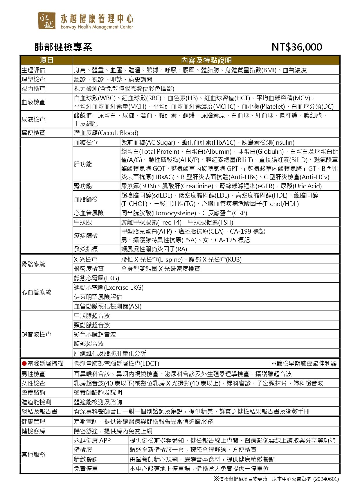 肺癌高居國人癌症死因首位,是健康的頭號殺手,為提供「有效健檢」,永越特別規劃「肺部健檢專案」,運用尖端儀器-CT640 低劑量肺部電腦斷層掃瞄,它可偵測到0.1公分以上的肺部細微結節,是目前偵測早期肺癌最有利方法,讓致病因子無所遁形。