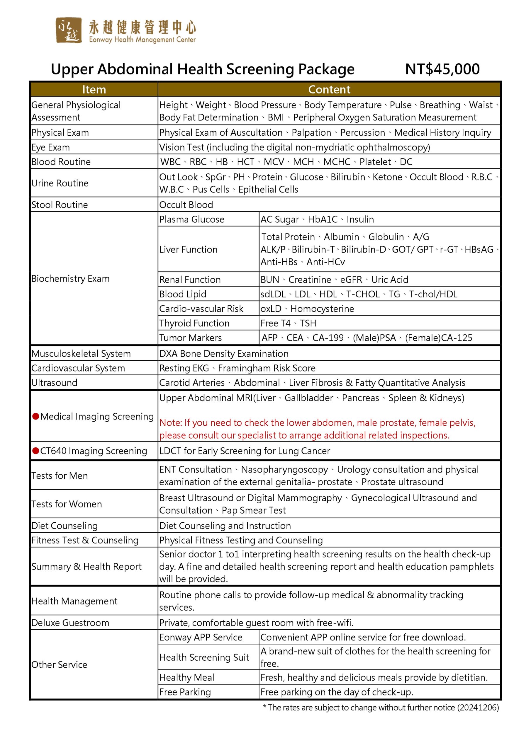 ● Tests for women:Breast Ultrasound or Digital Mammography、Gynecological Ultrasound and Consultation、Pap Smear Test.