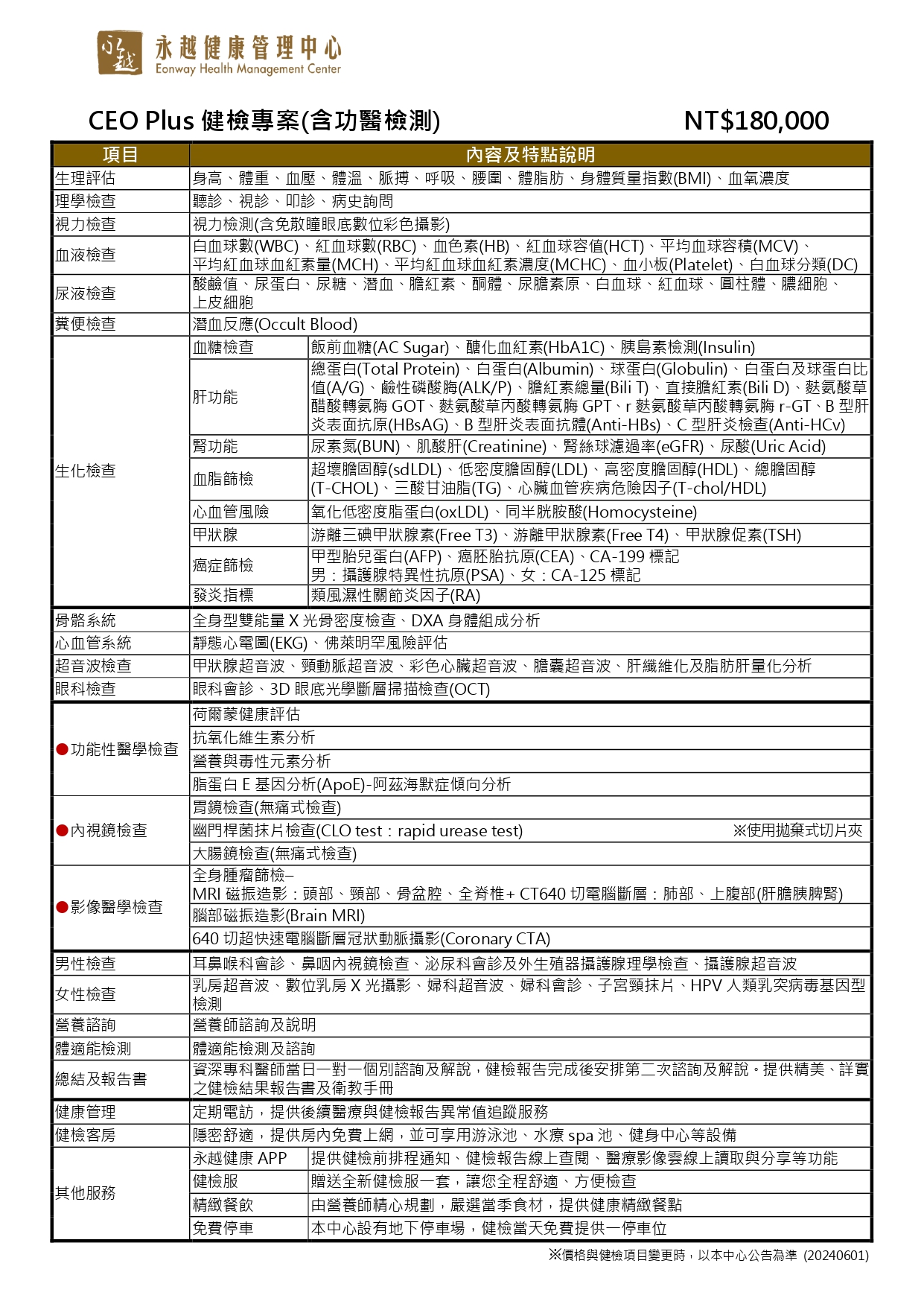 高規格、完整的高階全方位專案。除原CEO項目,並安排重要的功能醫學檢查評估,找出潛在疾病風險,提早為健康加滿分。