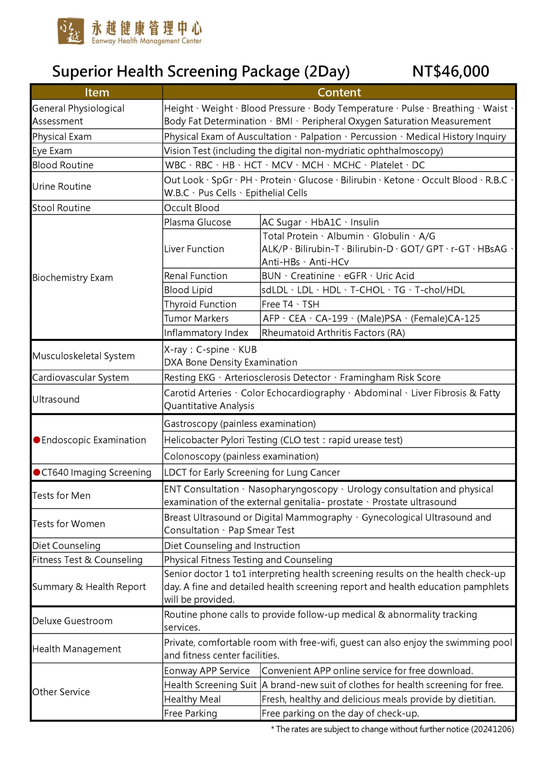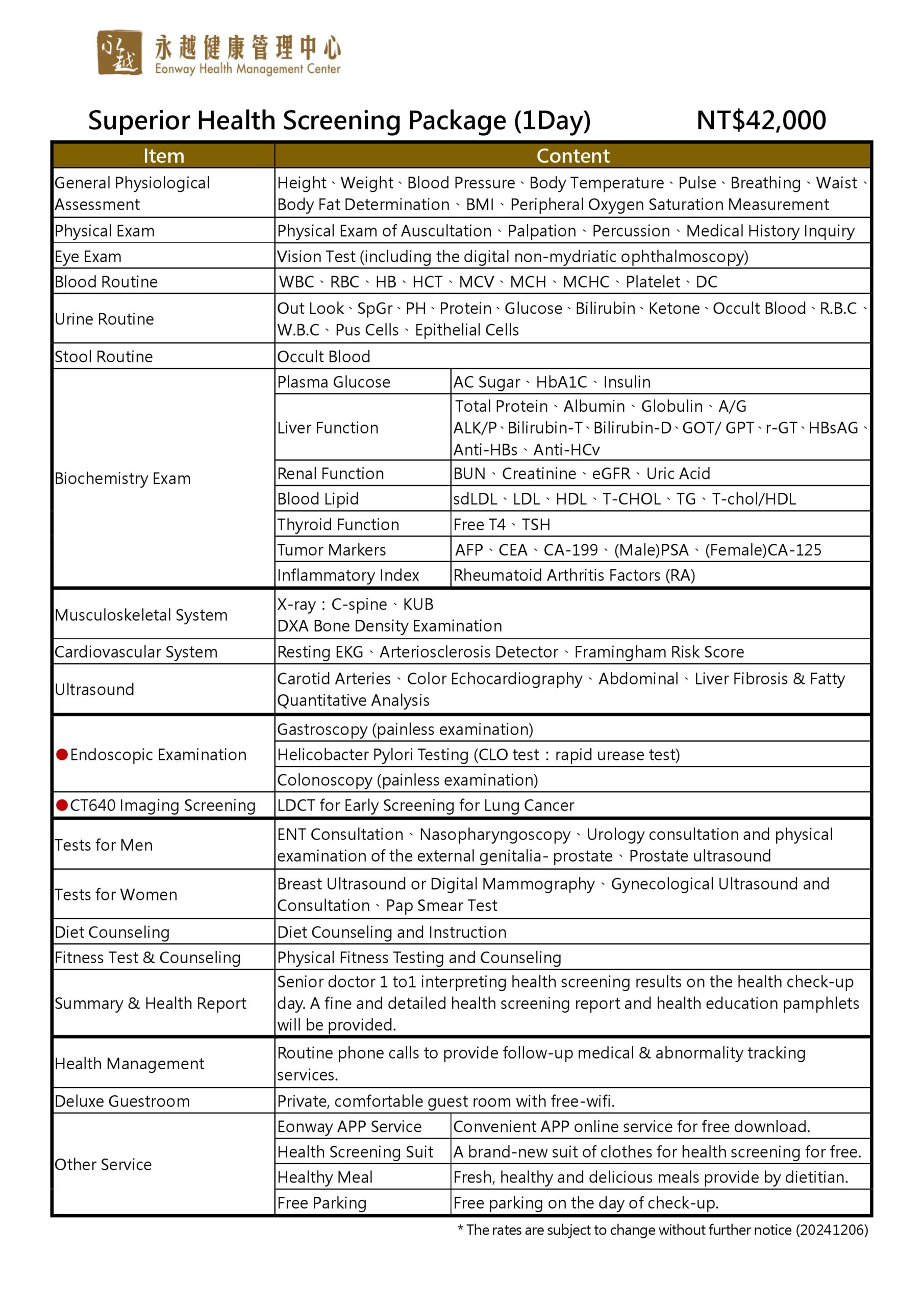 This package is most popular package. By targeting the most common cancers in Taiwan including lung cancer, colorectal cancer, breast cancer, and prostate cancer, the Superior Package offers examinations such as low-dose computed tomography, painless gastroscopy, and colonoscopy examination, breast ultrasound, mammography, and prostate ultrasound. There are also the biochemical analysis of blood, bone density examination, special gender-specific examinations, and consultations with specialists from different medical divisions. We are hoping to safeguard your health with a comprehensive health screening package.