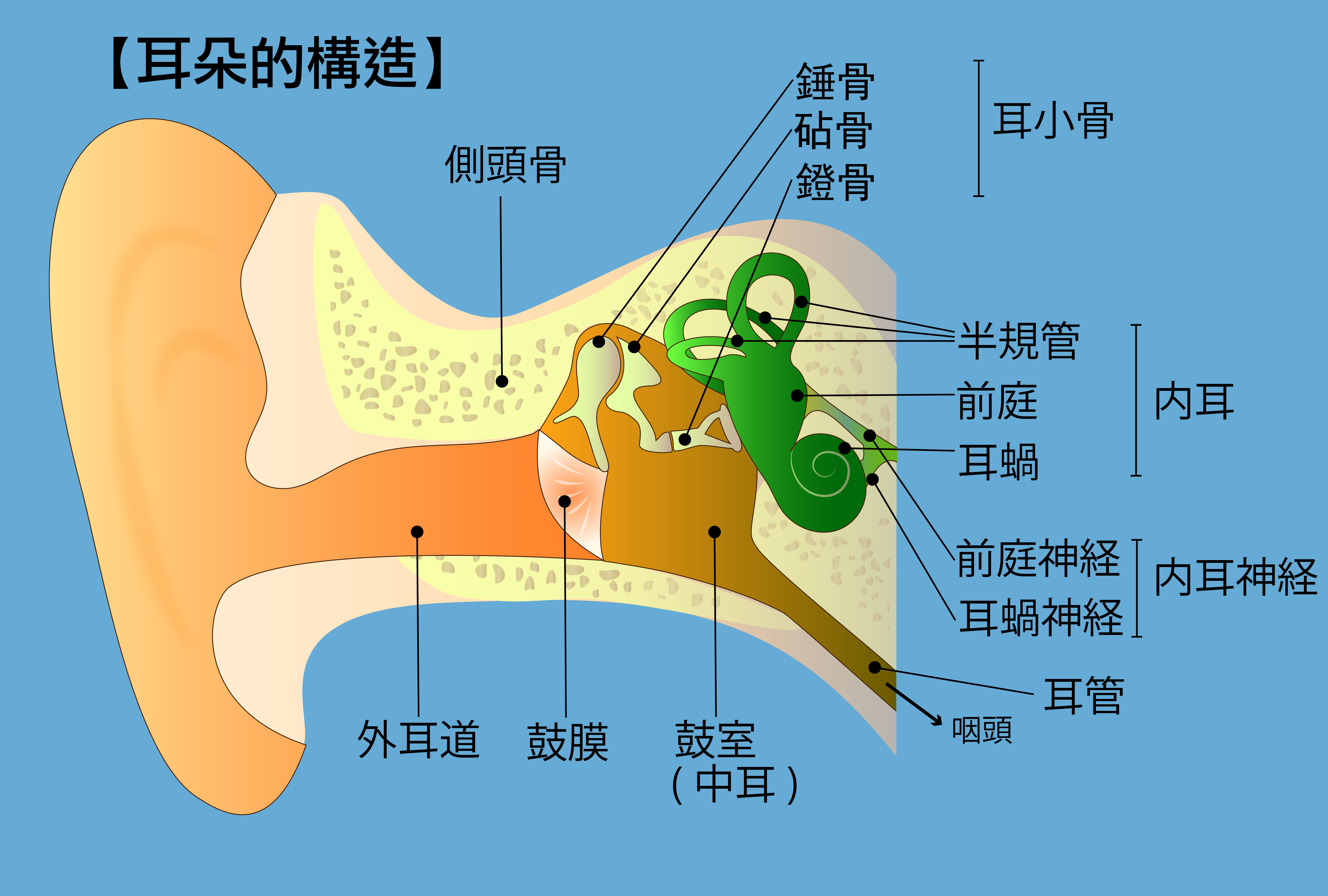 耳部不同於鼻、咽、喉領域,除了以左右各一條耳咽管(即歐氏管)和鼻咽腔連通外,可說是獨立的區域,容易發生的病變也不像其他部位,多和呼吸道感染有關。耳部可分為外耳、中耳及內耳,外耳為一皮膚管道,直接和外界交通,內耳為包埋於骨頭內之一組神經感應器,只有中耳是以耳咽管和體內交通之空腔,依此,好發的疾患彼此也有所不同,以下分別簡單介紹。