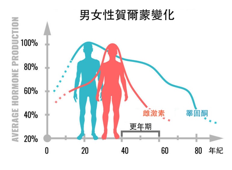 男性荷爾蒙(睪固酮)及女性荷爾蒙(雌激素),隨著年紀增長,分泌逐漸下降。