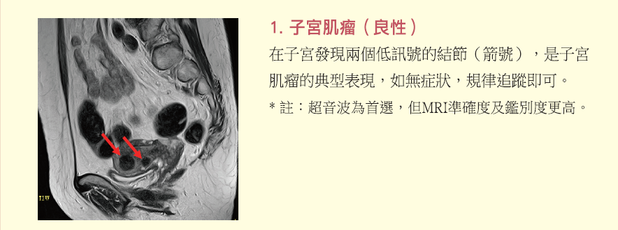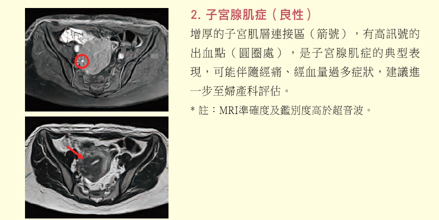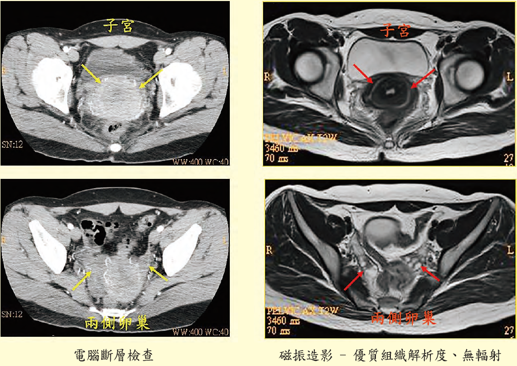 女性骨盆腔的影像學檢查或是診斷,通常是以超音波檢查(經腹部或是經陰道),做為初步檢查工具。如果要進一步獲得更高解析度、高分辨力的骨盆腔器官影像,則優先會考慮採取MRI磁振造影檢查。MRI檢查的特色,具有多種不同脈衝序列和多方向成像,提供軟組織高分辨力及高解析度,且對於不同成分的物質、病灶組成,區分力很高,此時再配合顯影劑的使用,可獲得非常高的病灶偵測靈敏度及屬性分析。其另一個優點,就是其「無輻射」,適用於女性骨盆腔的高階影像學檢查。相較之下,CT電腦斷層檢查,因受限於輻射及影像解析度不及MRI清晰,為替代性的工具選擇(請見下圖)。