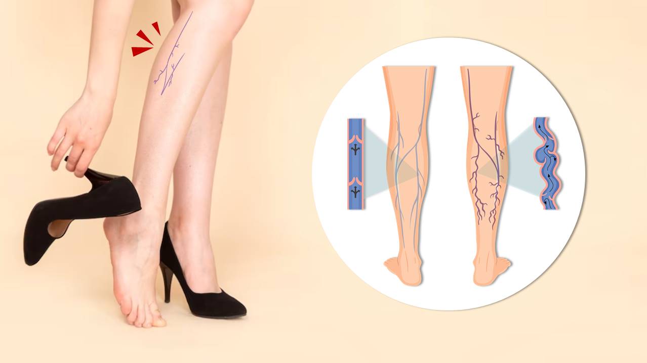靜脈曲張大部份出現在腿部,尤其小腿最常見。主要成因包括:懷孕、過胖、便秘、慢性咳嗽或久站久坐;此外,隨著年紀漸長,靜脈血管會變弱、失去彈性,也會導致靜脈曲張。初期沒有明顯的症狀,僅是小腿皮膚癢、腿部腫脹痠痛、疲勞、腿部沈重感;接著,站立時小腿後面及腿部內側出現明顯的藍色、腫大的靜脈,女性特別在經期前及經期中會變得更嚴重,有時連碰到都會痛,甚至會發生腳部血液淤積,腳踝變紫色的狀況。