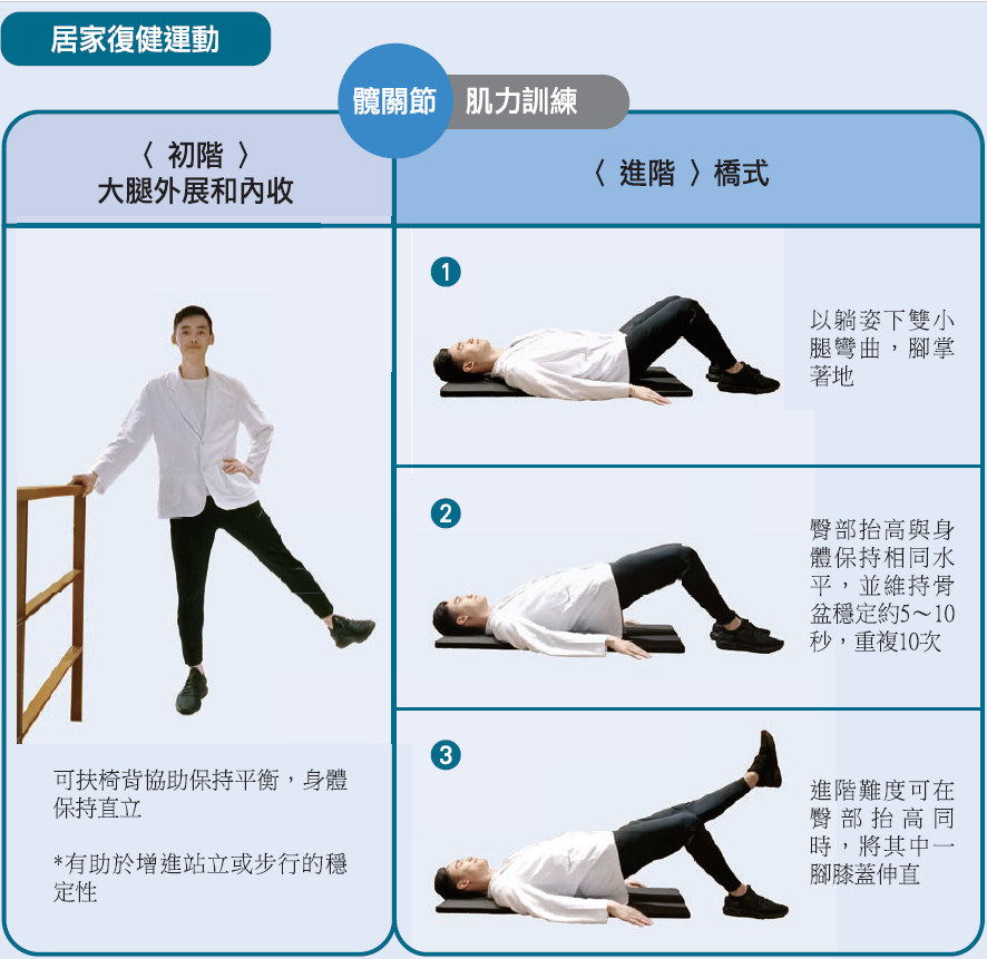 下肢關節退化常發生於髖關節與膝關節,缺乏運動或不正確的運動方式,都是影響關節老化的重要關鍵。根據美國運動醫學會(ACSM)指出,最適合高齡者的運動處方即負荷量60~80% 1RM(一次反覆最大重量),反覆次數8~15次,進行2回,1週2~3天。