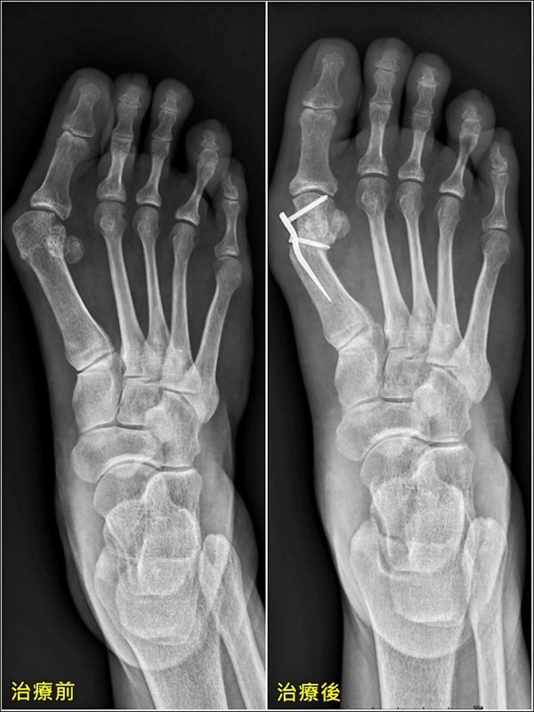 透過檢查發現,許女士拇趾外翻超過40度,且透過保守治療無法減緩症狀,故透過拇趾外翻矯正手術治療,透過修補軟組織,以及切骨矯正,放鬆拇趾外翻緊繃的韌帶,拉緊內側鬆弛的韌帶,並將往內轉移的大拇趾矯正到理想的角度,術後需練習腳趾抓握訓練、穿鞋墊,才能讓腳維持在正位上,避免病情復發。