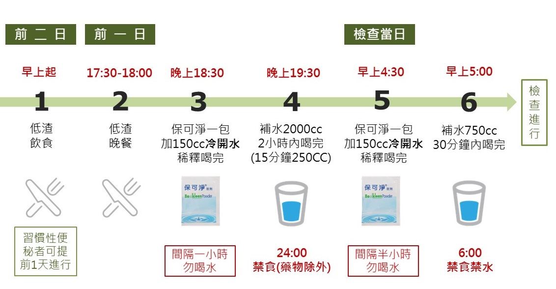 5 如糞液尚未清澈者,請於晚上12點前繼續喝水,直到糞液呈透明黃色,總水量請勿超過4000cc。
