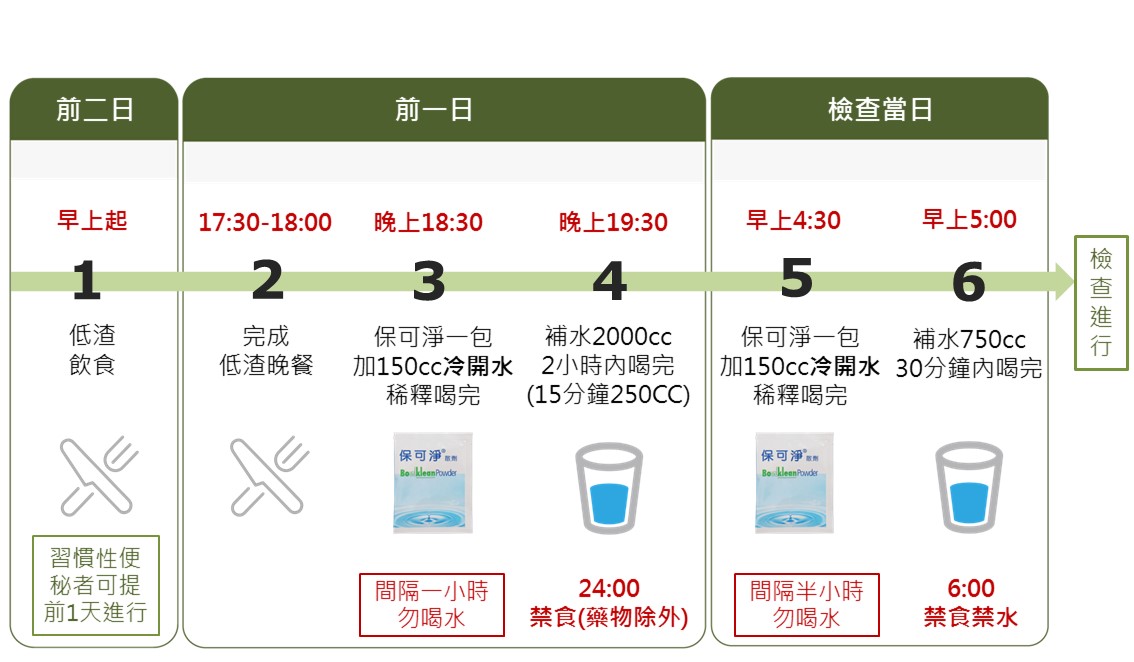 1【大腸鏡檢查】前二日需低渣飲食,勿食蔬菜、水果及奶製品,若飲食未能控制得宜,將影響檢查準確度。