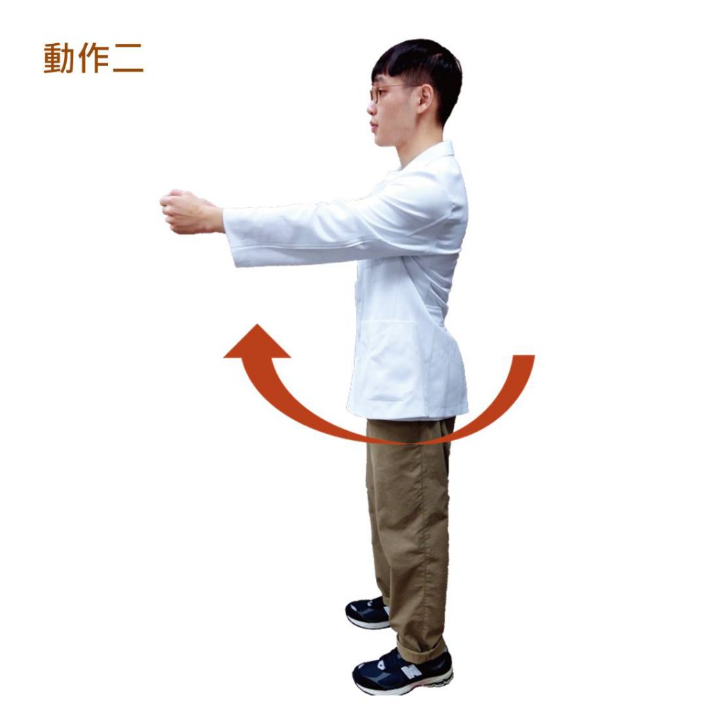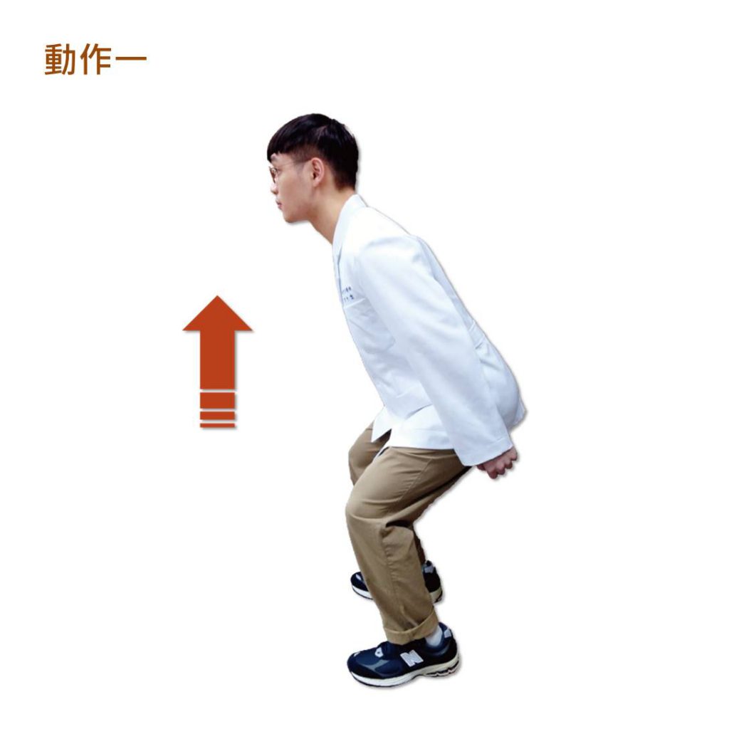 【動作說明】將膝蓋微微蹲下再蹬起來,雙手藉由蹲後起來的慣性自然甩動(不大力甩),平舉即可,切勿舉超過90度,過高反而會因肌肉承受不了而造成肩膀的問題。原則上一次做15下,做3回,若覺得可負擔,可再適度增加次數,或拿輕量的壺鈴或穩固的物品來增加難度。