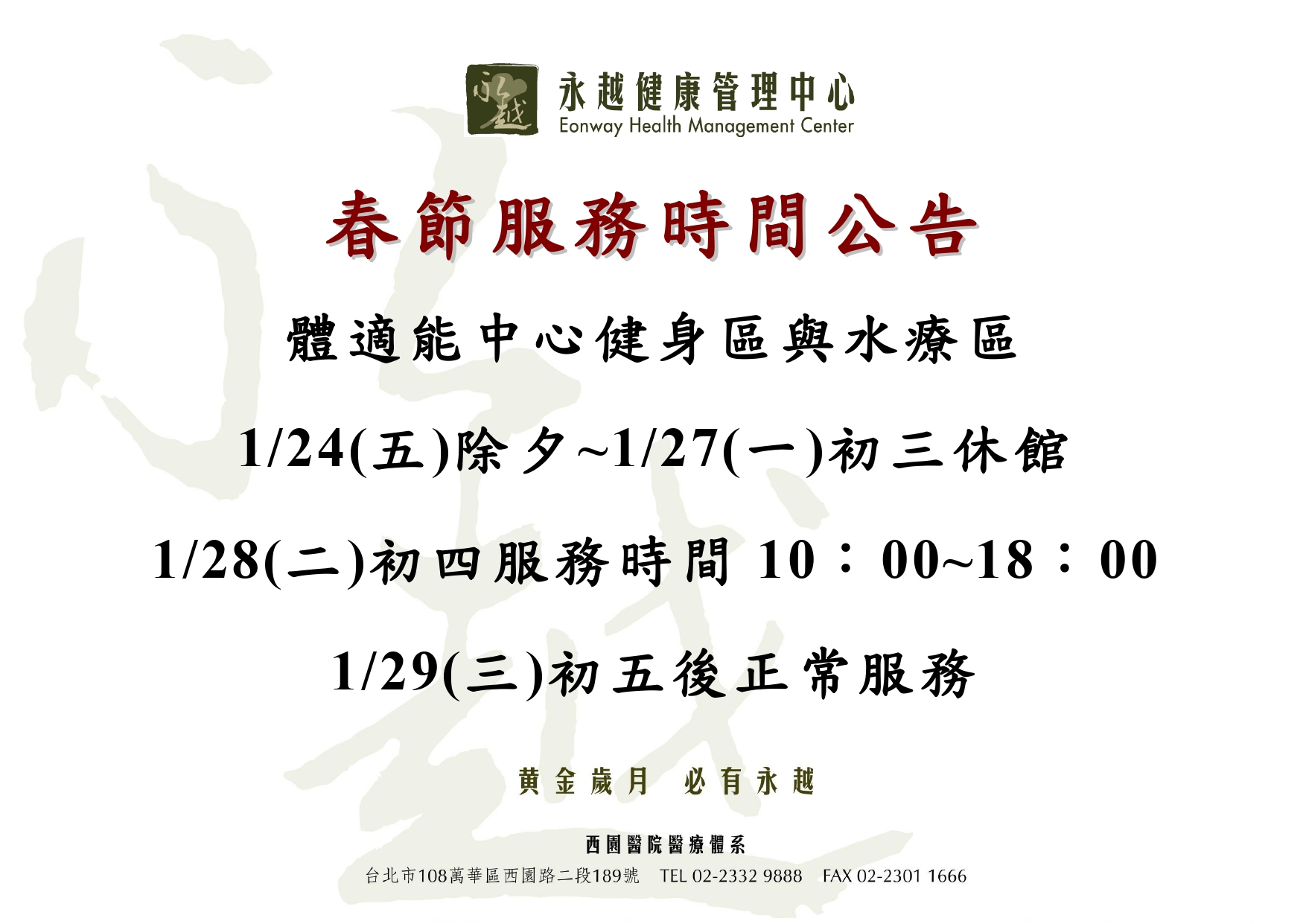 ● 1/29(三)初五 →照常服務 【體適能中心服務時間】