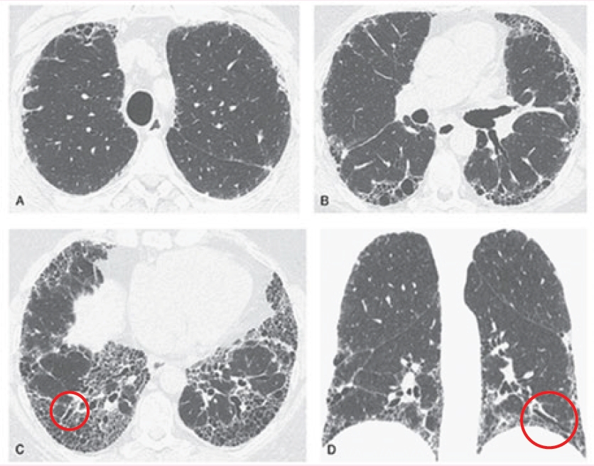 典型的UIP之HRCT影像(A-C為橫切面,D為重組冠狀面),顯示雙側肺部出現網狀結構和肋膜下蜂窩狀變化(肺纖維化的表現),且呈現顱尾分布,主要分布於外圍及基底部。雙下肺葉可見牽引性支氣管擴張(紅圈處)。High-Resolution CT of the Lung (2021)
