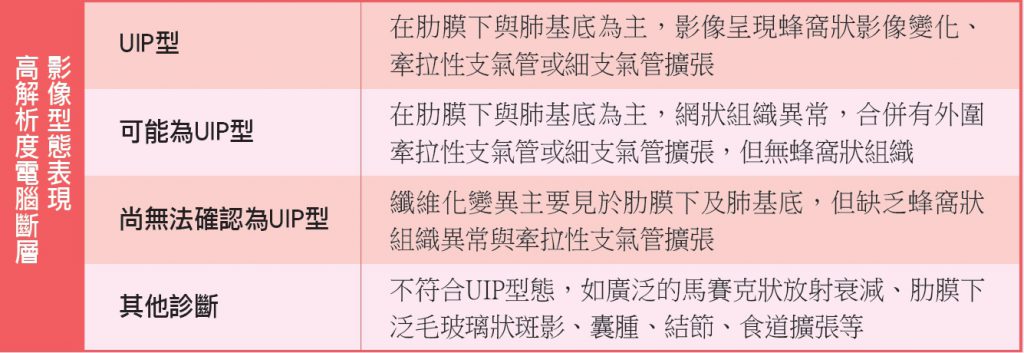 尋常性間質性肺炎(UIP),經高解析度電腦斷層(HRCT)檢查,纖維化的影像可分成以下四類型: