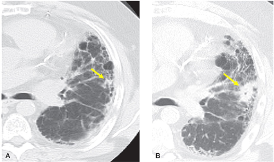 特發性肺纖維化-CT發現左下肺葉有一不規則小結節(圖A),四年後明顯變大(圖B),確診為肺癌。High-Resolution CT of the Lung (2021)