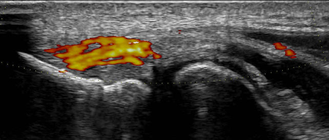 圖說:超音波影像下,可見手肘外側伸腕肌群的共同肌腱血流增加,意即組織發炎。