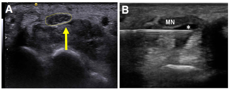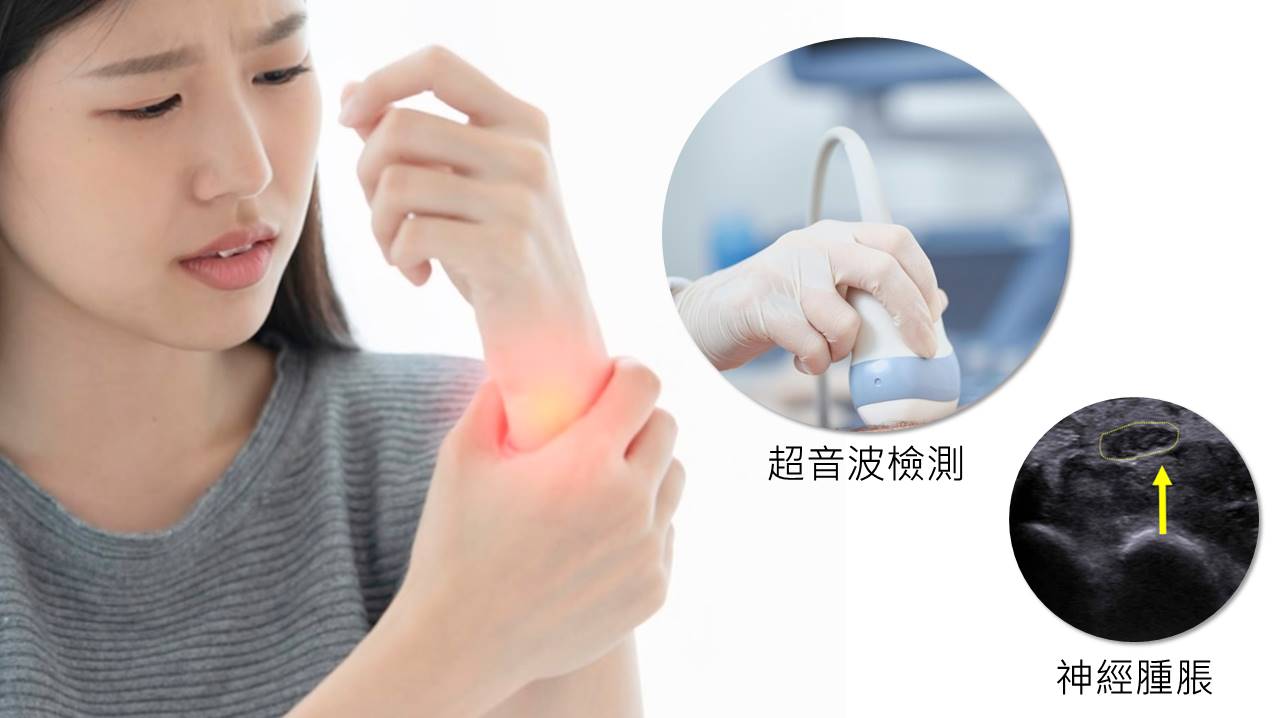 正中神經在手腕處壓迫,症狀是手部前三指半區域麻、刺痛或感覺異常,最常在夜間或騎摩托車時麻到需要甩手,嚴重時甚至合併手部無力(如扭毛巾、拿筷子),常見於中年、女性、過度使用手部的工作者。除了神經傳導與肌電圖檢查外,超音波可協助診斷及治療,除了看到神經腫脹,也可檢查造成壓迫的原因,並在超音波導引下,讓藥物精準注射到神經旁,降低不適症狀。