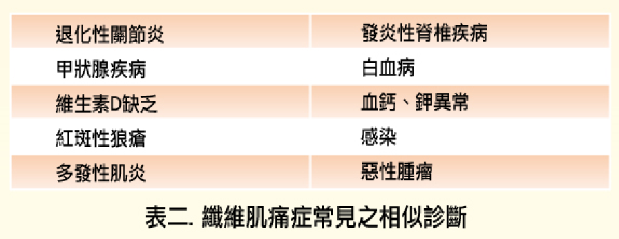 纖維肌痛並無法以特定的檢查來確診,須與其它可能以廣泛疼痛來表現的疾病作區分(附表二) 。然而若血液檢驗或診斷影像有異常而懷疑有其他疾病時,並不能排除纖維肌痛的可能,因兩者可能共存,所以需要醫病雙方配合細心釐清。