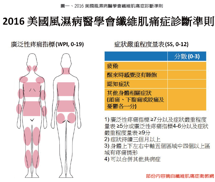 過去依美國風濕病學會的定義,疼痛範圍需同時涵蓋身體兩側與腰部上下區域且持續三個月以上。慢性廣泛疼痛合併身體18 個特定部位中超過11 處的壓痛點,就可診斷為纖維肌痛。新診斷基準不需要壓痛點,以病人感受為主,當症狀長達3個月以上,且符合中度疼痛指數以上,即可診斷為纖維肌痛症。(附表一)