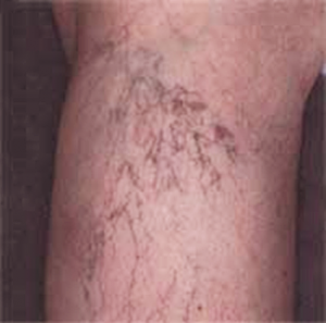 當靜脈曲張形成皮膚微血管擴張及蜘蛛型斑紋,若使用上述治療的效果不佳,可以進行「皮膚表面雷射治療」。治療過程中,以藥膏或冷敷來減少皮膚的灼熱感及疼痛,通常每次治療15至30分鐘,視情況可能需二或三次治療,副作用很小,患部多數會輕微發紅,數天後會消失。治療後,須用彈性襪合併口服藥及外用藥膏至少三個月。若靜脈曲張鼓脹成蚯蚓狀,就可能需要侵入性手術治療;然而合併深部靜脈栓塞的病患不可接受侵入性手術治療,否則會產生嚴重下肢水腫。