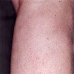 一位26歲的百貨公司專櫃小姐,因工作久站導致微血管擴張,於皮膚表皮浮現藍色蜘蛛型斑紋。起初病患接受彈性襪保養、口服類黃酮及外用七葉素藥膏,狀況獲得改善,但後來因懷孕而停止治療。生產後,病患的藍色蜘蛛型斑紋又明顯復發(如圖一)。為求小腿美觀,她接受皮膚表面雷射,並於雷射後接受三個月的彈性襪保養、口服及外用藥物,斑紋幾乎消失(如圖二)。醫師建議病患工作久站前穿著醫療型彈性襪保養,以免復發。