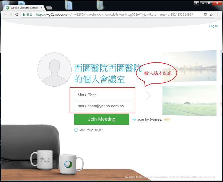 輸入您的姓名及電子信箱,點選綠色按鍵”Join Meeting”。