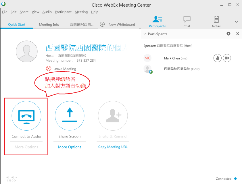 於會議指定時間,點選最左方”Connect to Audio”,進行視訊撥打。
