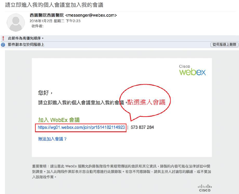 於視訊會議開始前,進入您的電子信箱,接收由西園醫院發送的視訊會議邀請通知。