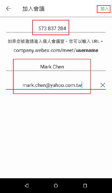 (2) 貼上先前複製的會議室號碼,並輸入姓名及e-Mail後,點選右上方”加入”。