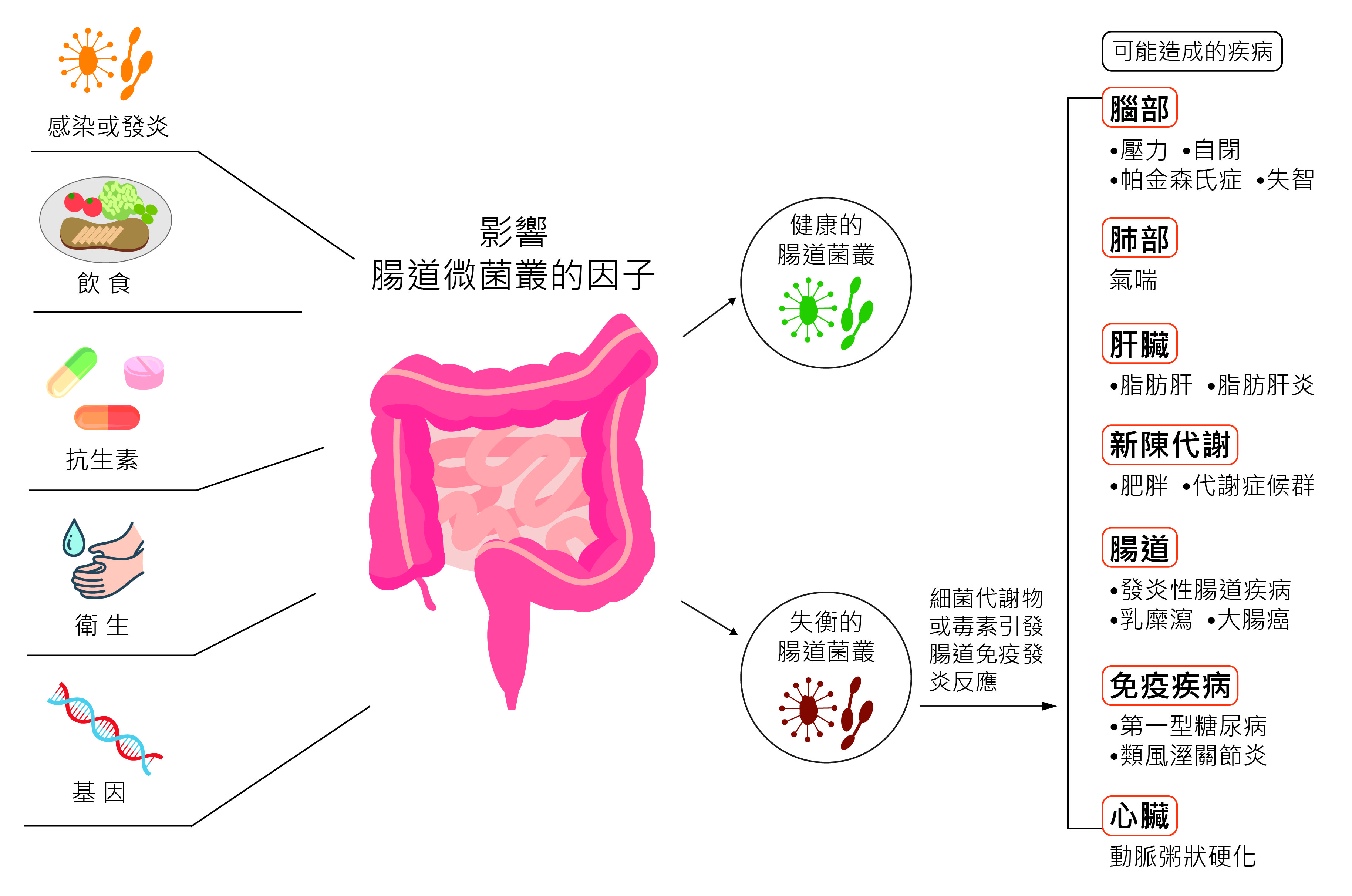 近年來,有越來越多疾病被認為可能與腸道微菌叢失調有關,從免疫性統疾病,如發炎性腸道疾病、類風溼性關節炎、第一型糖尿病、氣喘等;到非免疫性疾病,如失智、自閉、肥胖、心血管疾病等。雖然微菌叢造成這些疾病的機轉還未被釐清,但確實改變了西醫對於疾病治療的觀念。