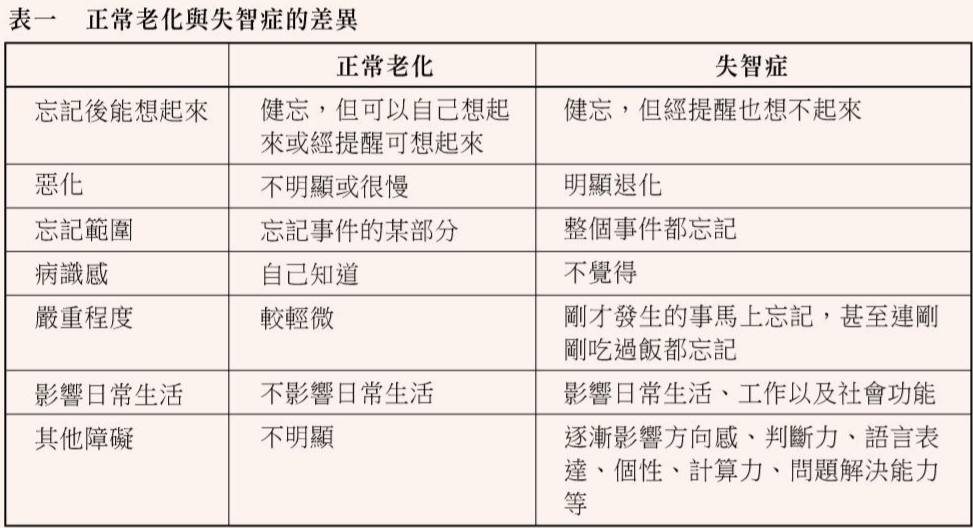 失智症是指腦部認知功能下降為主的疾病,病患出現明顯的記憶力退化、思考障礙、判斷力喪失、空間辨別能力衰退、說話時找不出合適字眼來表達或對一些指示無法遵從等。病程中經常合併行為異常,如憂鬱和焦慮、遊走與重複行為、疑心病與幻覺,且伴隨生活功能減退,以致家人提醒或協助,甚至完全仰賴他人。這些症狀不是發生一次,而是反覆發生,且持續一段時間,甚至日益加重。失智症病患的臨床表現各有不同,出現症狀也非常個別化,增加早期發現及診斷的難度,特別失智症是與正常老化的區分,故列表一幫助大家了解。
