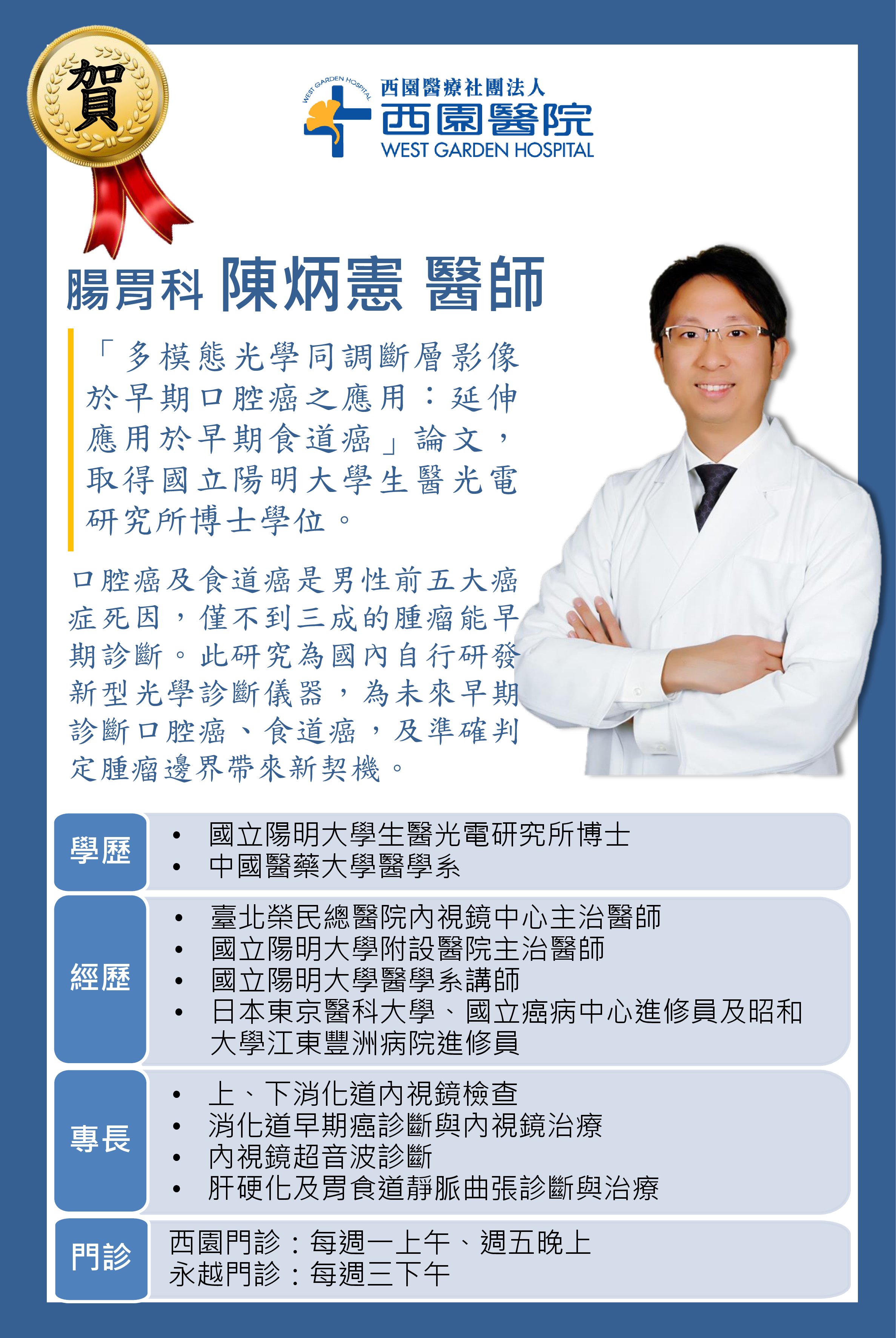 去年2月,本院邀請台北榮總內視鏡中心主治陳炳憲醫師,加入西園醫療團隊。陳醫師早期專攻消化道併發症,胃食道靜脈曲張出血;後期鑽研內視鏡領域,治療消化道早期腫瘤,並致力協助患者在治療和生活間取得平衡,重拾生活品質。陳醫師並在日本接受內視鏡手術大師Prof. Inoue 訓練指導,已為多位患者進行新內視鏡治療術,治療食道遲緩不能症,造福廣大病患。