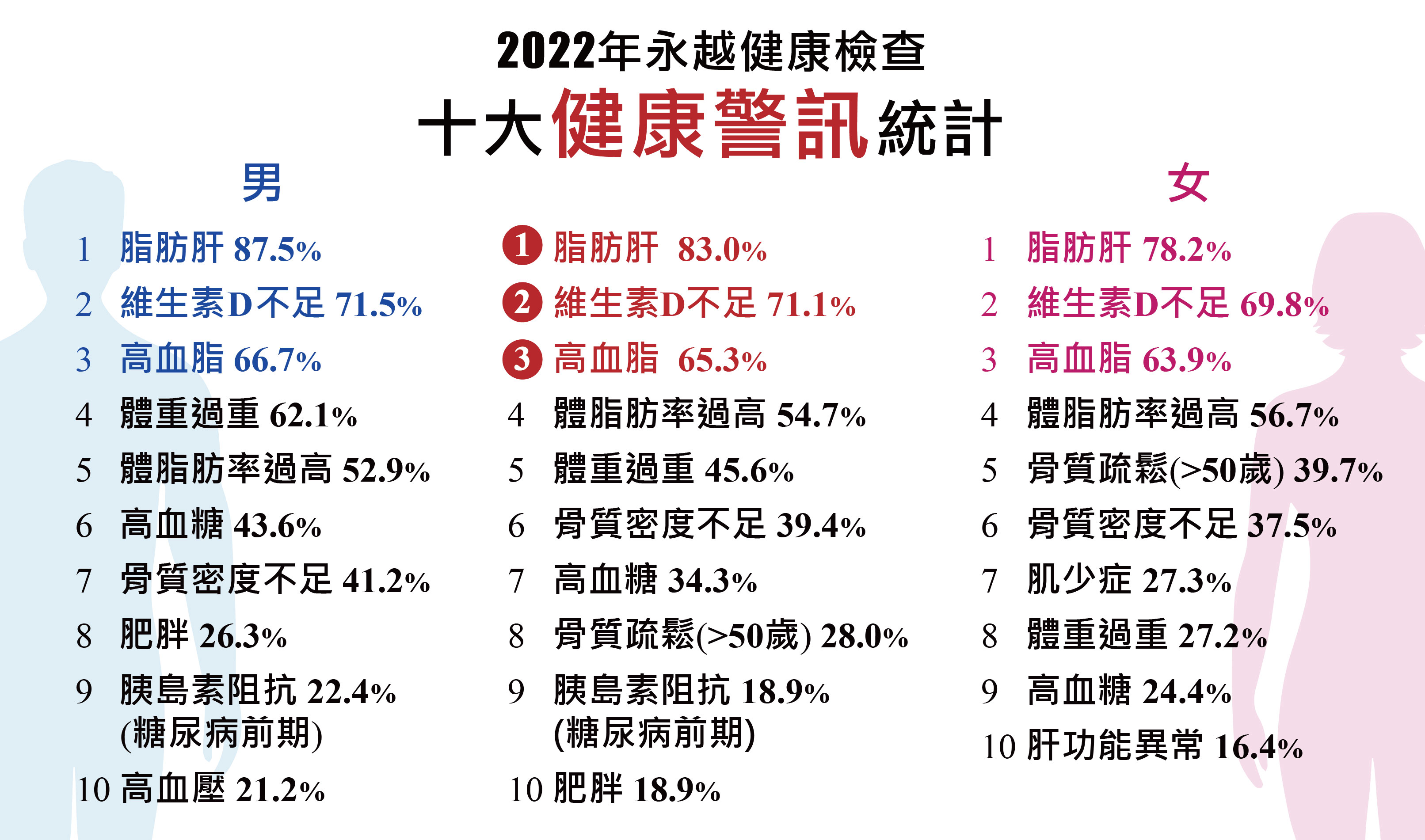 根據國際骨質疏鬆基金會所做的亞洲觀察報告(Asia-Pacific Regional Audit)及台灣地區流行病學資料估計,因為高齡人口越來越多,台灣50歲以上人口的骨質疏鬆發生率在2025年將增為42%,2050年增加至57%!而根據永越健康管理中心2022年健檢結果統計,男性骨質密度不足發生率為41.2%,女性則是37.5%,比率都極高。