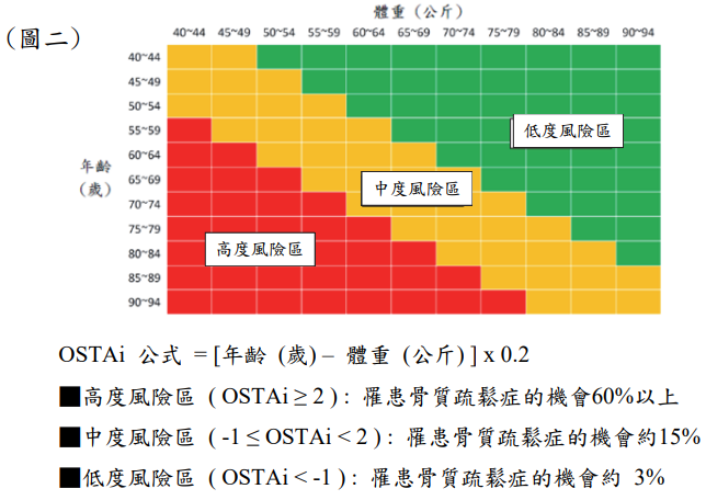 除了儀器檢查,婦女也可透過「台灣人骨質疏鬆症自我評量表 Osteoporosis Self-assessment tool for Taiwanese (OSTAi)」(圖二)迅速自我評估骨質疏鬆症可能的危險程度,建議圖表對照後,再使用 OSTAi 公式計算確認 風險程度。