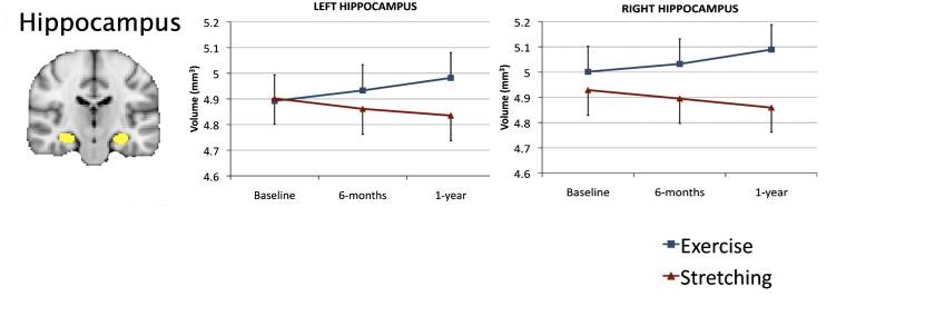 失智症中記憶力衰退與大腦顳葉海馬迴萎縮有關,在過去實證研究,運動對海馬迴體積是有增長空間。早在2011年,美國國家科學院發表有關運動與海馬迴相關實驗,研究將120位沒有失智症的老年人分成兩組,一組60人有氧運動介入,另一組60人為伸展運動,在介入前、6個月以及1年各檢測體適能、記憶力與腦部磁振造影。