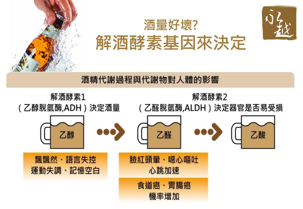 ADH1B基因及ALDH2基因檢測可提供個人酒精代謝能力的分析,及早發現解酒酵素缺乏者之重大疾病的高危險傾向,避免豪飲傷身,並及早因應與預防。