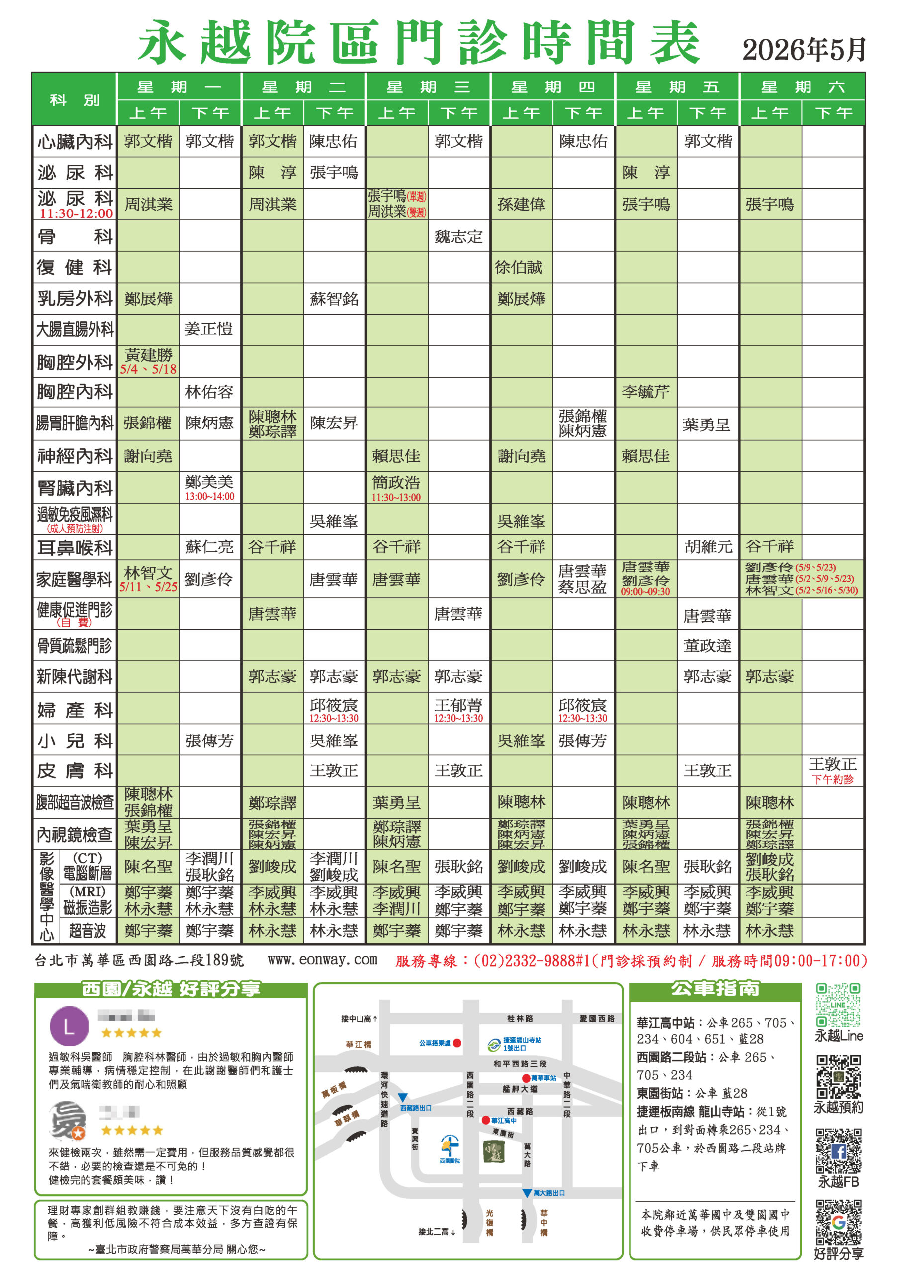 ●門診預約:採預約制,歡迎線上預約 或 電話預約(02)2332-9888 (服務時間09:00-17:00)。