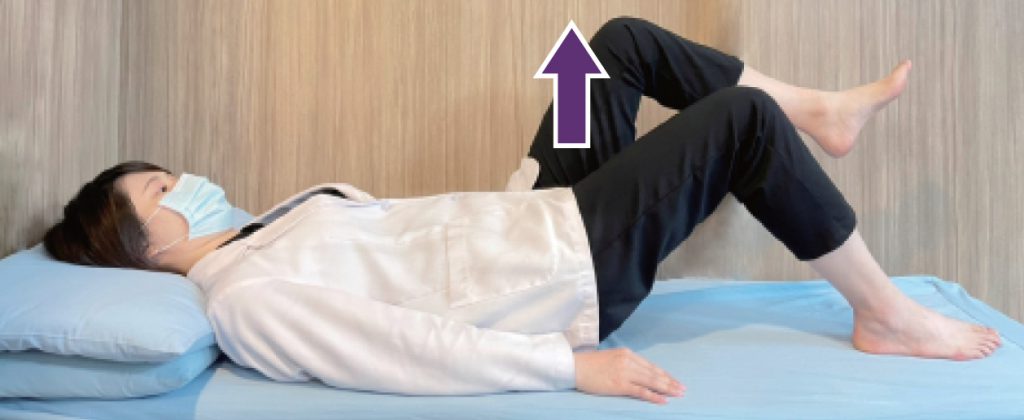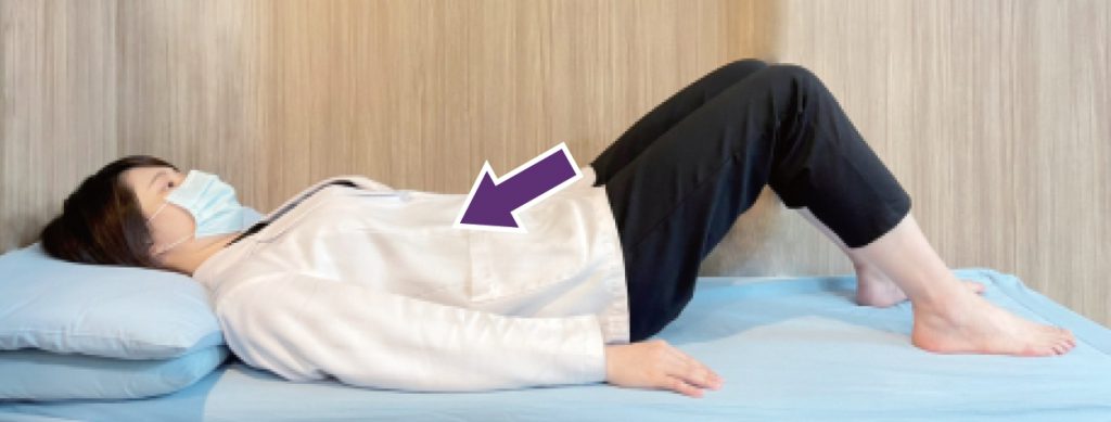 1.仰躺,雙腳彎曲踩地,大腿平行,兩側膝蓋不靠攏。將肚臍往內上方提起,腰部下沉,維持腹部用力。