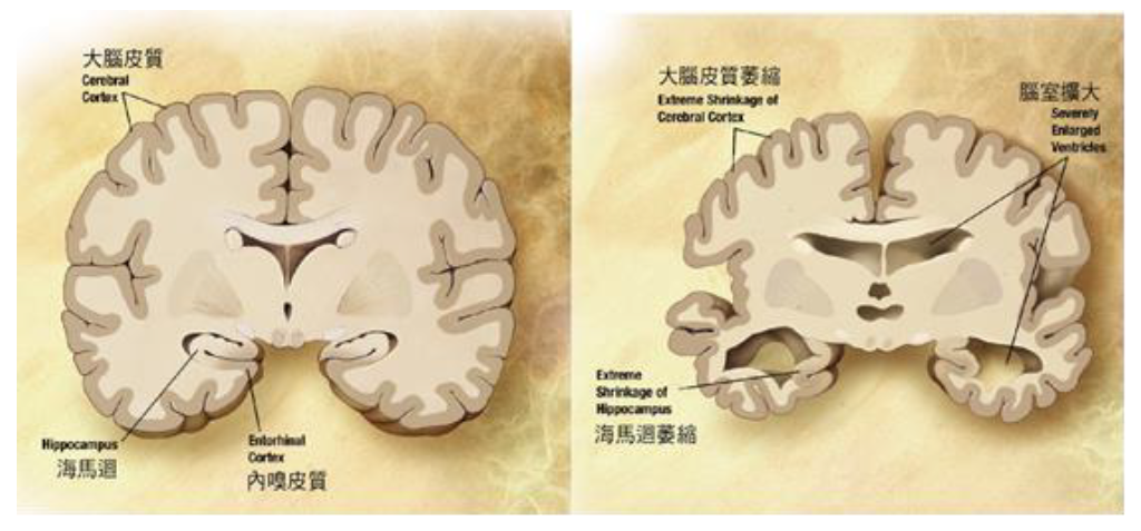 (圖四)正常人的大腦(左)與阿茲海默症病患的大腦(右),標識處為相異的特徵│資料來源:維基百科