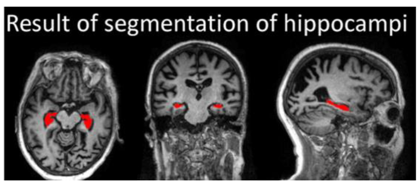 (圖五)腦部三種切面,紅色區域即為海馬迴位置。│ NeuroImage: Clinical 11 (2016) 435-49