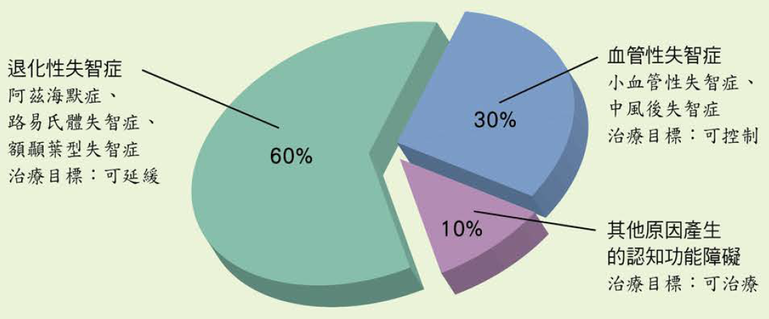 失智症主要分為退化性失智症、血管性失智症及其他原因產生的認知功能障礙(圖一)。其中以阿茲海默症(Alzheimer disease)最常見,約佔失智症病例的60%,俗稱老年失智症或老年癡呆症,是一種大腦不可逆、進行性的神經退化性疾病。
