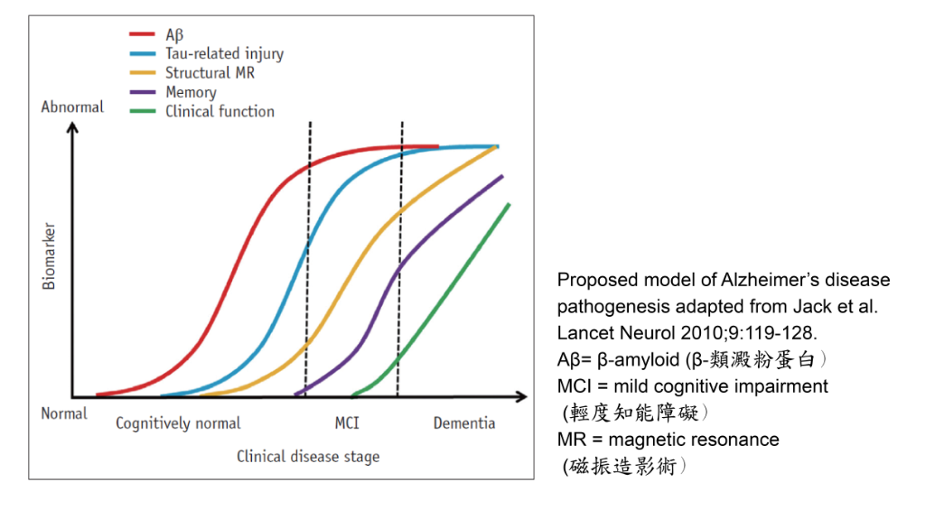 由下方曲線可以看出腦澱粉樣病變(紅色)及tau蛋白(藍色)的異狀發生在先,接著腦部組織結構在MRI影像(黃色)產生變化,最後才是知能障礙(紫色)以及臨床功能障礙(綠色)。換句話說,患者在意識到認知障礙(臨床前期)產生之前,即可透過腦澱粉樣病變、tau蛋白升高及腦部組織結構在MRI影像的變化等生物標記做偵測。