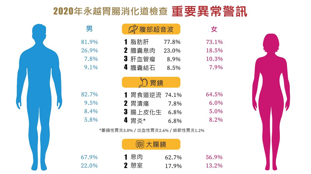 永越健康管理中心根據2020年共8148筆健檢數據,男女佔比53%:47%,其中有7569受檢者進行【腹部超音波檢查】,異常人數達7095(93.7%)。5287受檢者進行【胃鏡檢查】,異常達5161(97.6%)。5253受檢者進行【大腸鏡檢查】,異常人數也達5110(97.3%)。