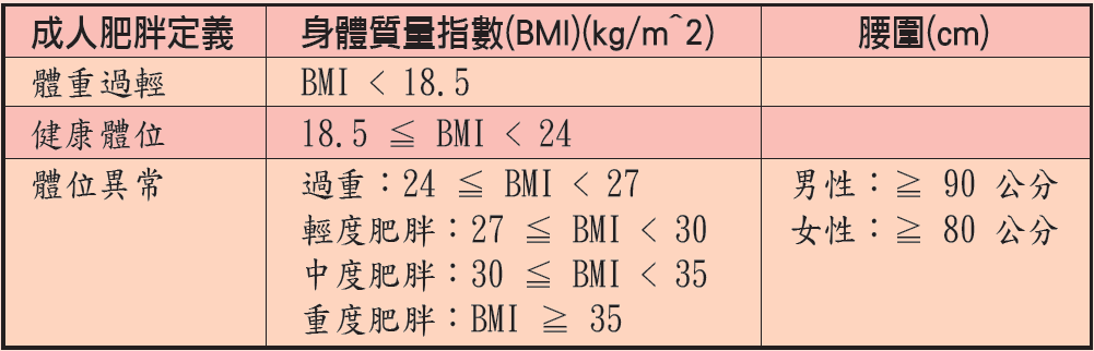 肥胖,已被世界衛生組織定義為一種「慢性病」,再也不是衣食無虞、生活富足或德高望重的象徵,反而是慢性發炎、胰島素阻抗和生活型態不良的結果。比起健康體重者,肥胖者發生糖尿病、代謝症候群及血脂異常的風險超過三倍,發生高血壓、心血管疾病、膝關節炎及痛風也有二倍風險。研究證實,當肥胖者減少5%以上體重(如成人90公斤,減少5公斤),就可以為健康帶來許多益處,高血壓、糖尿病等與肥胖相關疾病將可改善。