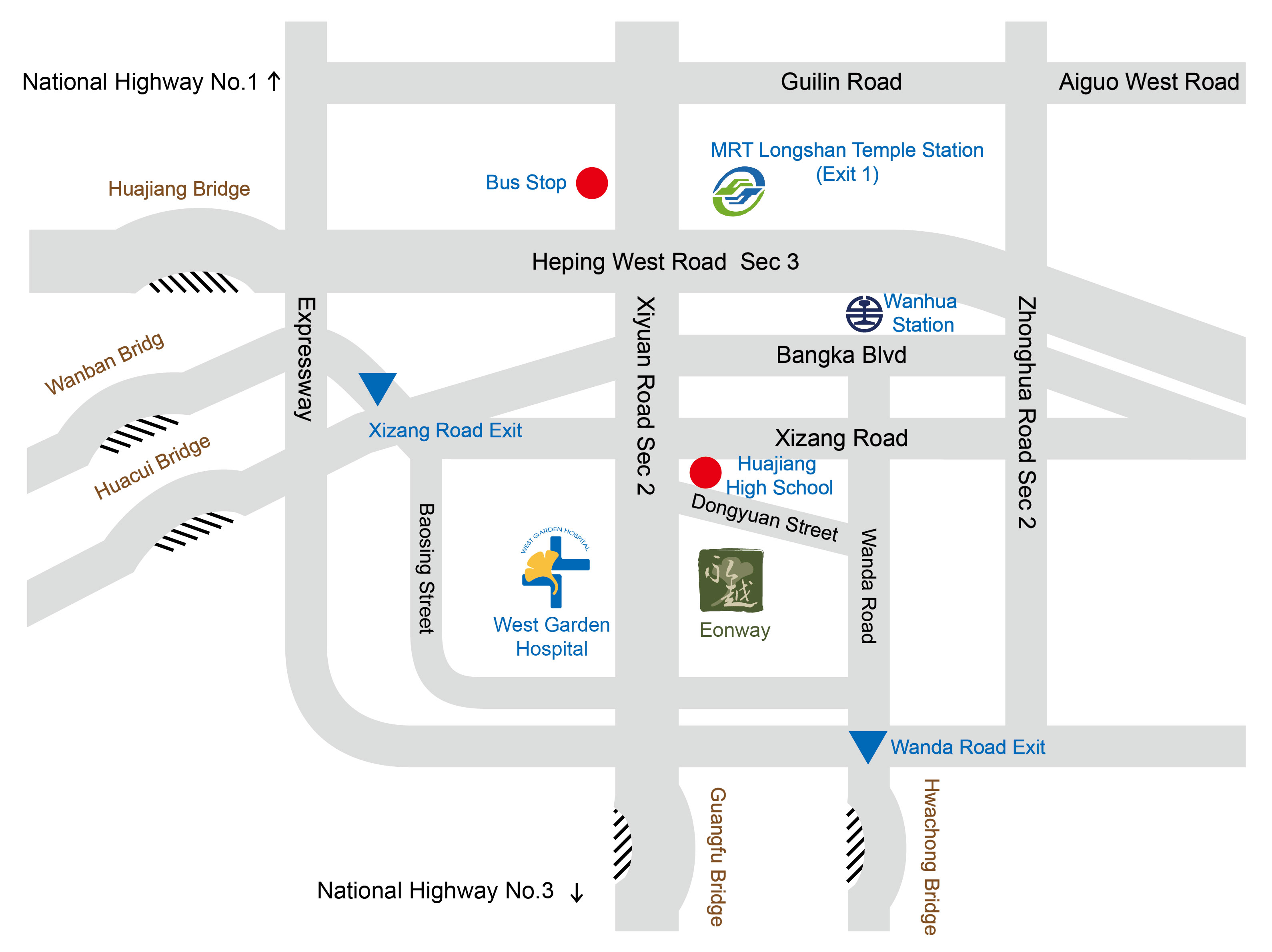 Heading north, and driving past the Taishan toll station and Wugu Interchange. Afterward, driving along the Xi Wu Viaduct and getting off at the Huanhe N. Road exit ramp. Driving along the Huanhe S. Expressway towards Xindian and Wanhua Dist., and keeping to the right lane. Getting off the expressway at the Xizang Road exit ramp and turning right into Xizang Road and then right into Baoxing Street. Driving for approximately 50 meters after turning left into Xiyuan Road and you will arrive at Eonway.