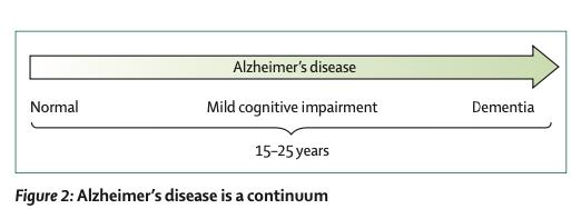 (圖1) 連續體(continuum)從正常(指帶有阿茲海默症生物標記陽性的無症狀個體)過渡到輕度認知障礙(MCI)最終轉變為失智症。Lancet 2021; 397: 1577–90