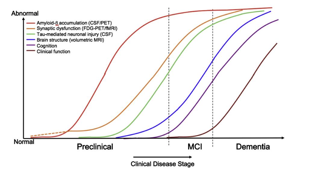 從具有阿茲海默症證據的生物標記的無症狀時期(臨床前期)開始發展,過渡到輕微認知(輕度認知障礙[MCI])和/或神經行為改變(輕度行為障礙[MBI])最終轉變為阿茲海默失智症。臨床前期為阿茲海默症連續體的最早階段,是漫長的無症狀階段(潛伏期),個體有阿茲海默症病理證據(乙型類澱粉蛋白斑塊和神經纖維纏結),但無認知或功能下降證據,日常生活不受影響。這個階段的持續時間因人而異,可能潛伏15-20年,但通常持續6-10年,取決於發病年齡(圖2)。